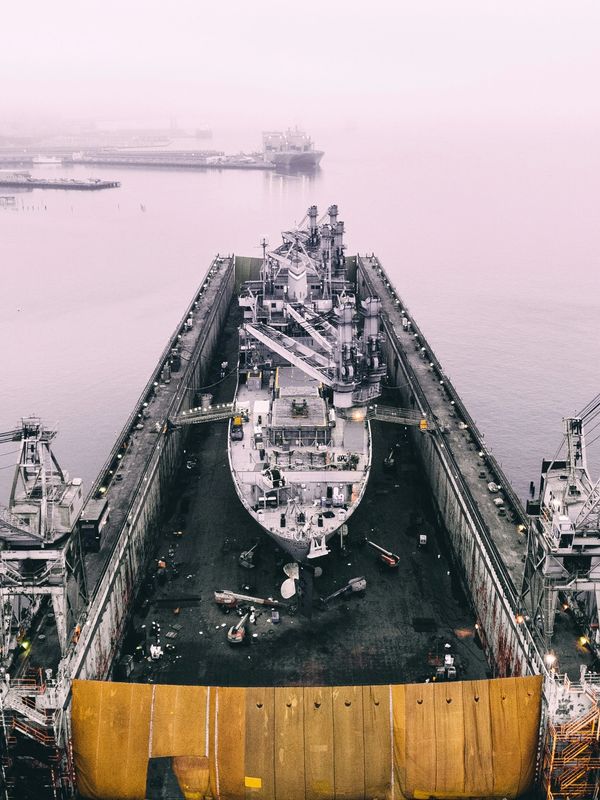 photo of ship on inside drydock, Shipyard Mission Bay